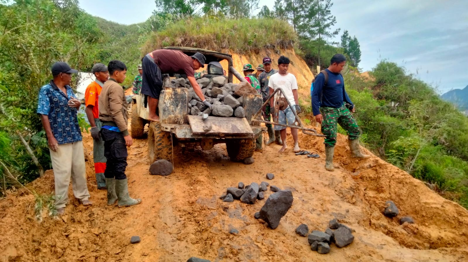 Lokasi sasaran TMMD yang berada di daerah perbukitan dengan kondisi jalan tanah dan licin akibat curah hujan tinggi menjadi tantangan tersendiri bagi personel satgas di lapangan.