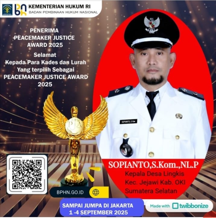 Kepala Desa Lingkis, Kecamatan Jejawi, Kabupaten Ogan Komering Ilir (OKI), Sopianto, S.Kom, berhasil meraih Peacemaker Justice Award 2025 pada ajang nasional yang digelar di Jakarta. Penghargaan ini diberikan atas dedikasi dan kiprahnya dalam menjaga kerukunan serta menegakkan nilai keadilan di wilayahnya.