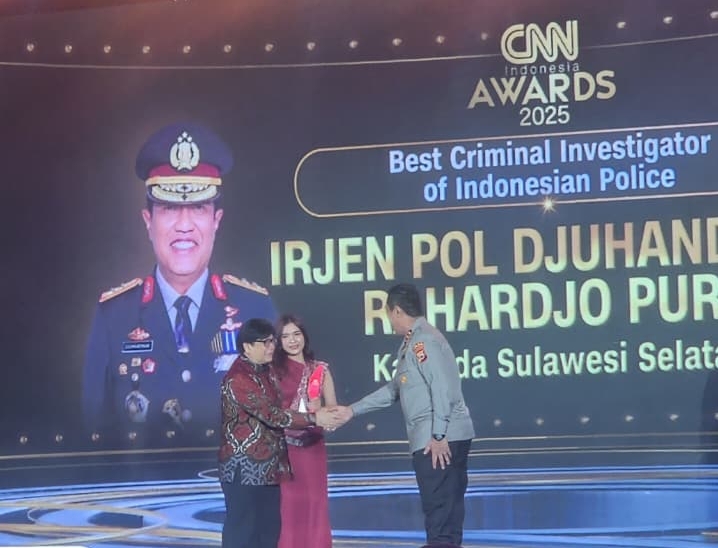 HOTNEWS.WEB.ID, MAKASSAR-Kepala Kepolisian Daerah Sulawesi Selatan (Kapolda Sulsel) Irjen Pol. Djuhandani Rahardjo Puro, S.H., M.H., menerima penghargaan Best Criminal Investigator of Indonesian Police dalam ajang CNN Indonesia Awards 2025 yang digelar di The Ritz-Carlton Jakarta, Mega Kuningan, pada Jumat (31/10/2025).