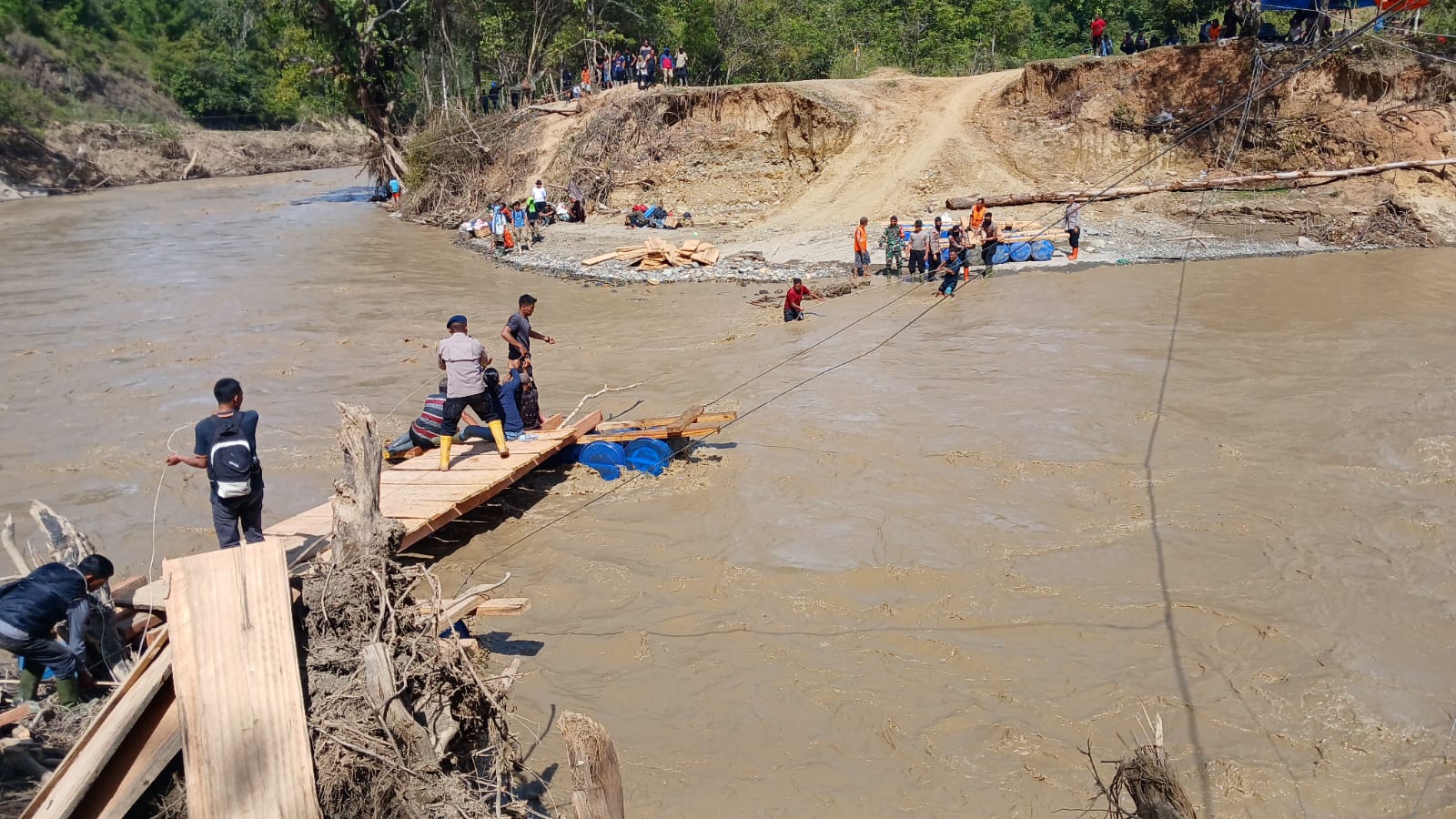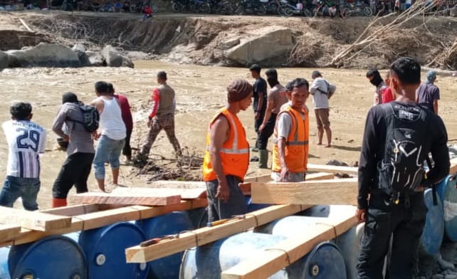 Jembatan darurat tersebut dibangun dengan memanfaatkan drum dan material kayu agar dapat segera digunakan masyarakat dalam menunjang aktivitas sehari-hari, baik menuju desa sekitar maupun ke luar wilayah kecamatan.