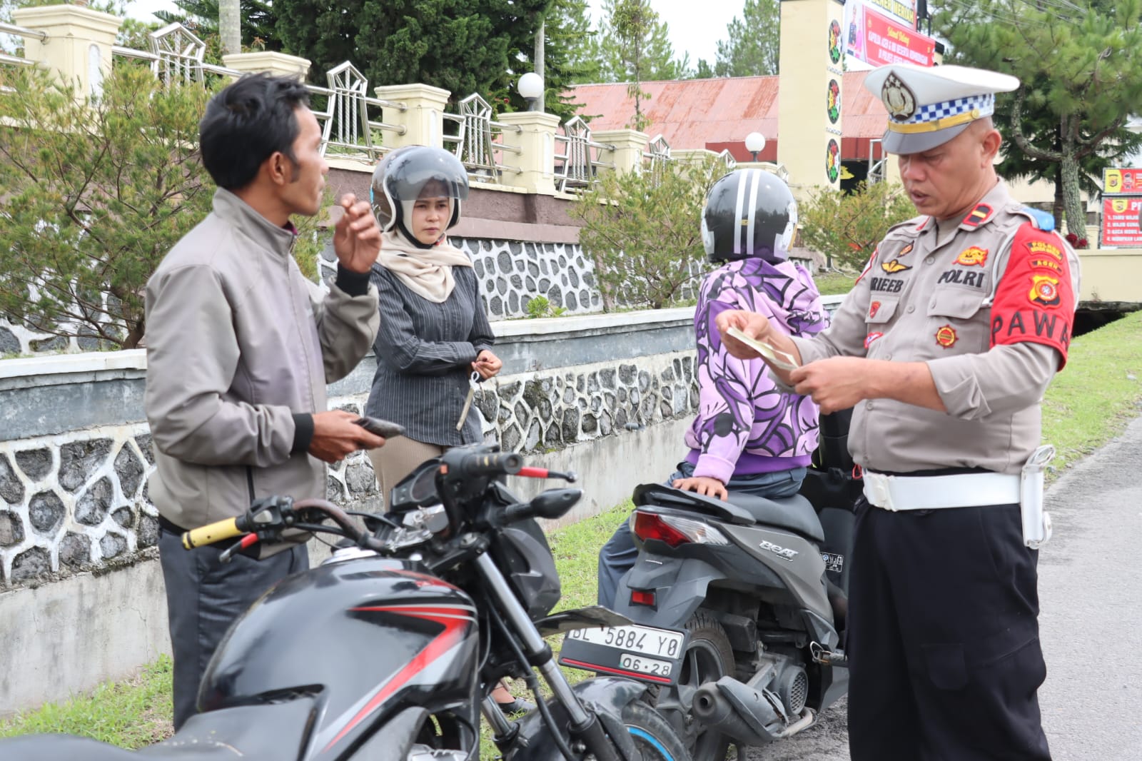Kasi Humas Ipda Eriadi mengatakan para pengemudi diberikan pemahaman mengenai tata cara berlalu lintas yang benar, termasuk penggunaan helm standar, menggunakan safety belt, kelengkapan surat kendaraan, serta larangan melawan arus dan penggunaan ponsel saat berkendara.