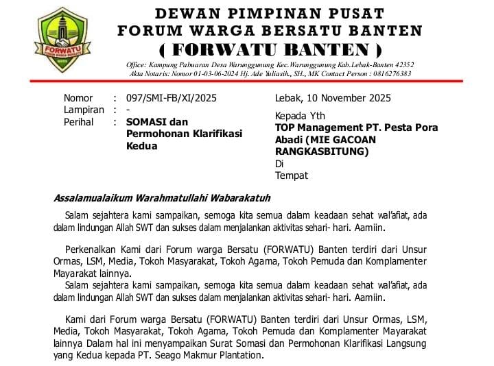 – Bahwa Kami sebelumnya sudah mengirimkan Surat Somasi dan Permohonan Klarifikasi Pertama dengan Nomor Surat 089/SMI-FB/XI/2025 Pada Tanggal 3 November 2025 Terkait dengan pelanggaran hukum yang dilakukan oleh Mie Gacoan di wilayah Rangkasbitung Kabupaten Lebak, terkait dengan tidak dimilikinya Izin Persetujuan Bangunan Gedung (PBG) yang sah, pembayaran upah yang tidak sesuai dengan Upah Minimum Kabupaten/Kota (UMK) yang berlaku, dan pemanfaatan bantaran sungai secara illegal. akan tetapi pihak PT. Pesta Pora Abadi (Mie Gacoan Rangkasbitung) sama sekali tidak ada tanggapan dan tindakan korektif Atas Tuntutan dalam Surat yang kami kirimkan.